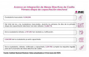 Para cumplir con ese propósito, el Instituto Nacional Electoral ya realizó la insaculación de 13 millones 244 mil 44 ciudadanos, de los cuales más de 12 millones han sido visitados para informales que han sido seleccionados como potenciales funcionarios de casilla y por lo menos, hasta el reciente 15 de marzo, ya había 2 millones 260 mil 382 capacitados, de los cuales se ha valorado que 2 millones 239 mil 905 cumplen los requisitos legales para ser funcionarios de mesa directiva de casilla.