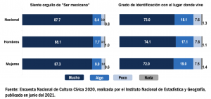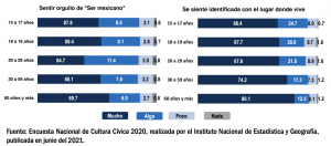 Los mexicanos tienen un alto sentido de arraigo, pertenencia e identidad con sus comunidades y con su país. En todo México, el 87.7 por ciento de la población de 15 años de edad y mayores, se siente orgulloso de ser mexicano, mientras que el 73 por ciento se siente muy identificado con el lugar donde vive.