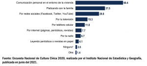 ¿Cómo se informa la gente sobre los asuntos que son de su interés? A nivel nacional el 97.6 por ciento de las personas de 15 años de edad y mayores, dijo tener mucho interés en los asuntos o problemas de su colonia o localidad. Para el 60.4 por ciento de los encuestados la fuente más directa de información es la comunicación personal en el entorno de su vivienda y para el 37.5 por ciento, las pláticas con sus familiares.