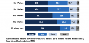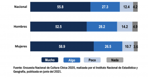 Todos estos datos están en las conclusiones de la Encuesta Nacional de Cultura Cívica, realizada por el Instituto Nacional de Estadística y Geografía (INEGI), cara a cara, con habitantes de 25 mil 113 hogares en seis regiones del país, entre el 17 de agosto y el 18 de septiembre del 2020. La encuesta es la más robusta realizada hasta la fecha y se publicó en junio del 2021.