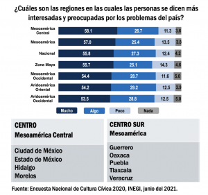 ¿Cuáles son las regiones en las cuales las personas se dicen más interesadas y preocupadas por los problemas del país? Los porcentajes más altos, por encima de la media nacional corresponden a las regiones Mesoamérica Central, que incluye a Ciudad de México, Estado de México, Hidalgo y Morelos; y en segundo lugar Mesoamérica Centro Sur, en la cual están consideradas Guerrero, Oaxaca, Puebla, Tlaxcala y Veracruz.
