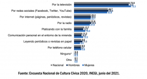 ¿A través de qué medios de comunicación se informa la gente? El 73.9 por ciento de las personas del país que expresaron estar muy interesadas y preocupadas por los asuntos públicos declaró que se informaba a través de la televisión, en tanto que el 44.7 por ciento dijo que lo hacía a través de redes sociales (principalmente Facebook, Twitter y YouTube), mientras que otro 22.2 por señaló que obtenía información por internet, en páginas digitales de periódicos y revistas.