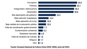 El 54.6 por ciento de la población de 15 años de edad y mayores que declaró estar muy interesada o preocupada por los asuntos del país, consideró que el principal problema de México es la corrupción; en segundo lugar, el 53.1 por ciento dijo que la calamidad más importante es la pobreza, en tanto que el 50.4 por ciento ubicó como su principal preocupación la inseguridad.