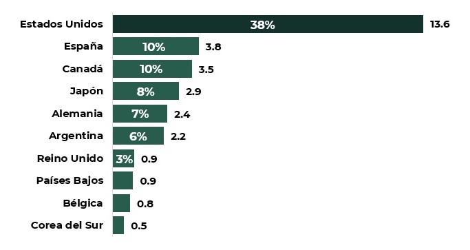 De la IED registrada para 2023, el 38 por ciento de los flujos de inversión provienen de los Estados Unidos, posicionándolo como el principal país inversionista en México.