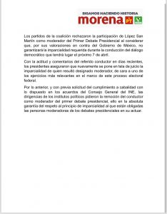 Ciudad de México 25 de marzo (SinEmbargo).- Los partidos Morena, del Trabajo (PT) y Verde Ecologista de México (PVEM) solicitaron al Instituto Nacional Electoral (INE) la remoción del periodista Manuel López San Martín como moderador del primer debate presidencial.