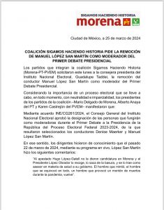 La coalición "Sigamos Haciendo Historia" mencionó que el comunicador Manuel López San Martín hizo valoraciones en contra de sus tres partidos, fomentando la negativa de imparcialidad durante el próximo debate presidencial del 7 de abril.