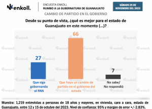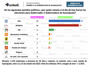 Llamó poderosamente la atención la encuesta dada a conocer el sábado 25 de noviembre del 2023 por la consultora Enkoll, que anunciaba una contienda muy cerrada en Guanajuato.