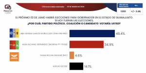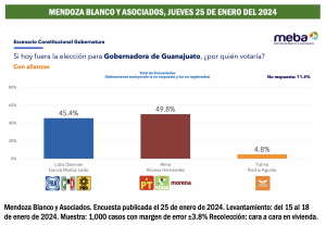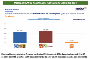 Las tendencias electorales que causaron mucha inquietud fueron reiteradas por la consultora Mendoza Blanco y Asociados, en su ejercicio demoscópico sobre Guanajuato, publicado el jueves 25 de enero del 2924.