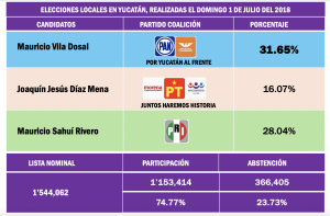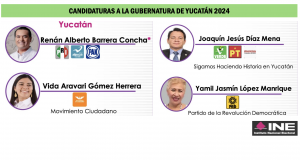 En la contienda por la Gubernatura de Yucatán, Joaquín “Huacho” Díaz Mena tendría el respaldo del 41 por ciento de los yucatecos, frente al 24 por ciento de Renán Barrera Concha. En lejano tercer lugar estarían empatadas, por apenas el uno por ciento de la intención de votos, Vida Gómez Herrera, de Movimiento Ciudadano, y Jazmín López Manrique, del Partido de la Revolución Democrática.