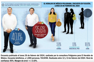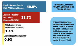 En la encuesta del lunes 26 de febrero, El Heraldo atribuía al panista Renán Barrera una ventaja de 40.1 por ciento contra 35.6 por ciento del morenista Joaquín “Huacho” Díaz Mena, mientras que en la contienda por partidos, Morena marcaba 37.5 por ciento en las preferencias electorales, contra el 36.8 por ciento del PAN.