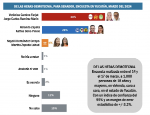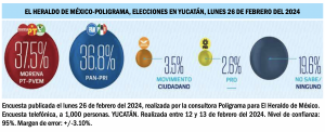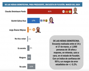 También es notable en la encuesta de De las Heras que la candidata presidencial de la coalición Sigamos Haciendo Historia, Claudia Sheinbaum Pardo, tendría el 61 por ciento de la intención de voto en su favor en el estado de Yucatán, contra apenas el 17 por ciento de Xóchitl Gálvez y el 2 por ciento de Jorge Álvarez Máynez.