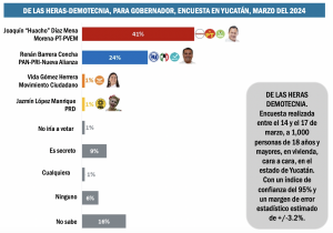 El registro más actualizado sobre las tendencias en Yucatán lo publicó la segunda quincena de marzo la consultora De las Heras-Demotecnia, con tendencias electorales favorables a la coalición encabezada por Morena.