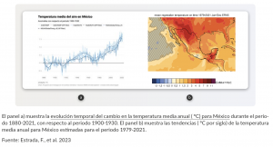 De acuerdo con el documento, la temperatura media del aire en México ha aumentado alrededor de 1.69 grados Celsius con respecto a inicios del siglo XX. "Tomando como referencia el periodo 1900-1930, el incremento en la temperatura media del aire en México en 2022 se encuentra en el rango de 1.59 ºC a 1.81 ºC, dependiendo de la base de datos utilizada. El incremento y la tasa de aumento en la temperatura del aire anual promedio en México son mayores que el promedio global", detalla.