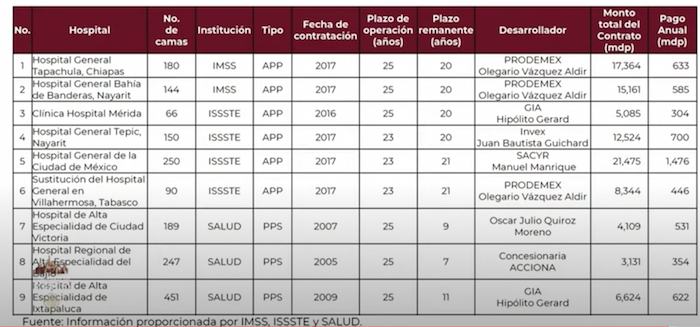 “En el primer caso, la empresa GIA+A tiene dos contratos por 11.7 mil millones; en el segundo, Prodemex ostenta tres contrataciones por más de 40 mil millones de pesos; y en el tercero, Marhnos, con 4 mil millones. Los otros beneficiarios son: Ortiz Construcciones en sociedad con Grupo Invex (más de 21 mil millones); las españolas Sacyr –12.5 mil millones– y Acciona –3 mil millones–. Los avalúos demuestran que el sobrecosto de los nueve nosocomios es de 1 mil 789 por ciento, pues aunque valen apenas 5 mil 200 millones, la administración federal está obligada a pagarles 93 mil 817 millones de pesos. Las contrataciones se hicieron en los sexenios de Fox, Calderón y Peña bajo la figura de asociación público privada, uno de los múltiples eufemismos de la privatización”, escribió en esa ocasión la periodista Nancy Flores.