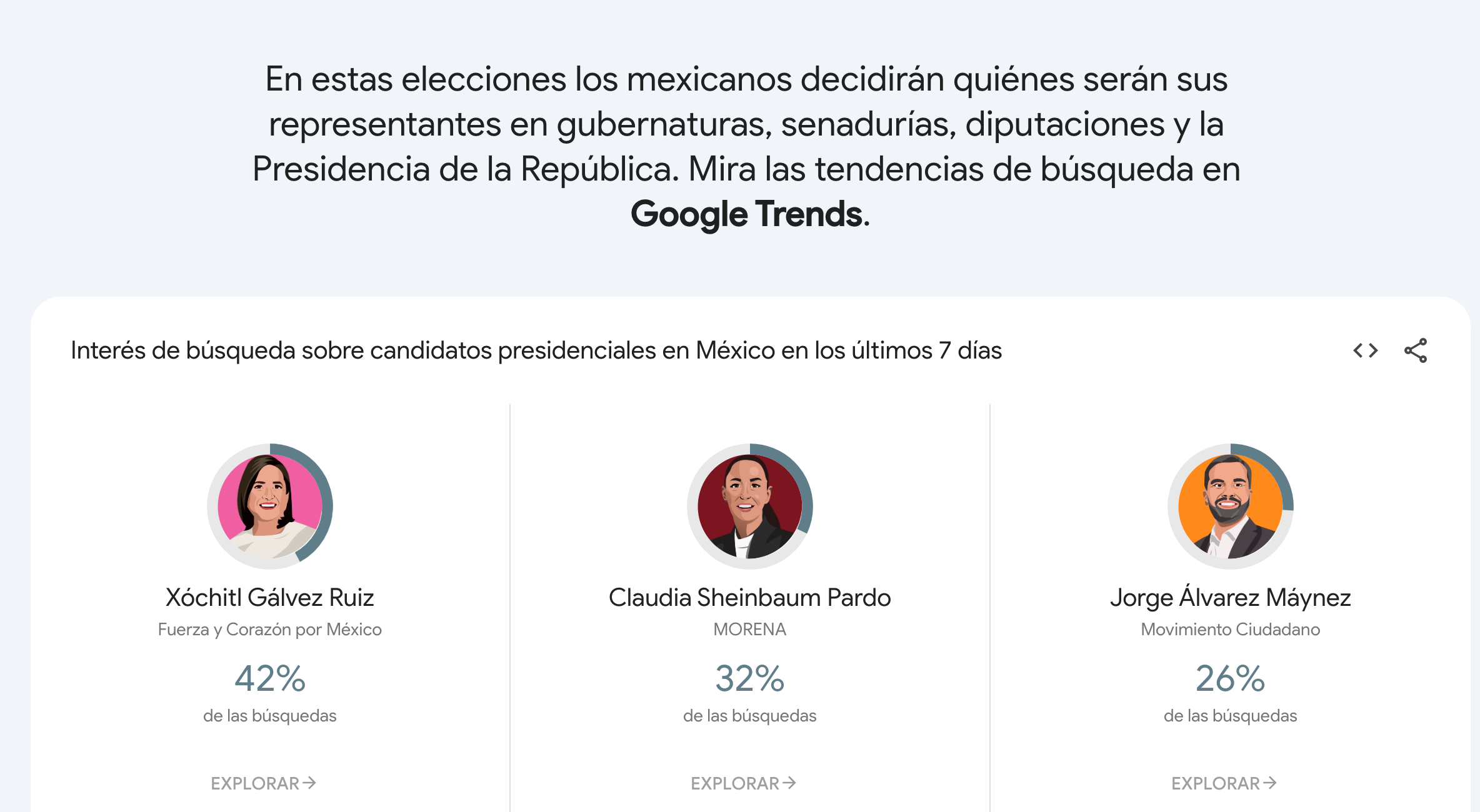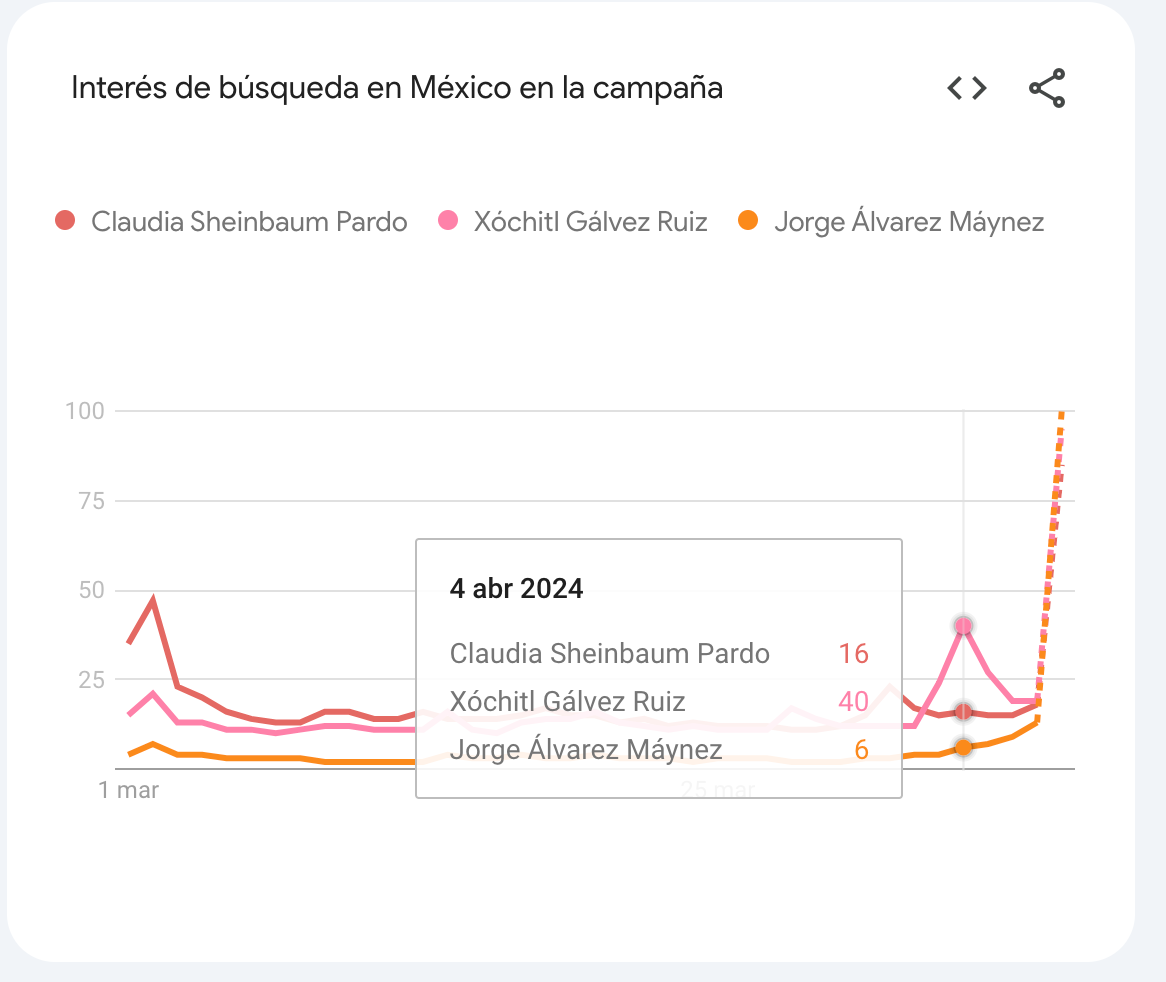 De acuerdo con datos de la plataforma Google Trends, en su sección dedicada a las Elecciones de México, la media del interés de búsqueda sobre candidatos presidenciales en los últimos 7 días muestra a Xóchitl Gálvez, de la alianza Fuerza y Corazón por México (PAN-PRI-PRD), con el 42 por ciento de interés, seguida por Claudia Sheinbaum Pardo, de la coalición Sigamos haciendo historia (Morena, PT y PVEM), con un 32 por ciento, y el candidato de Movimiento Ciudadano, Jorge Álvarez Máynez, con un 26 por ciento.