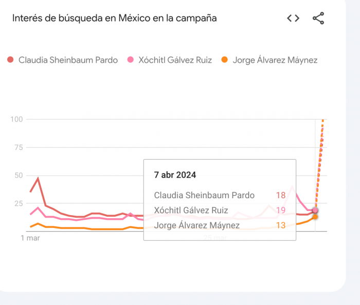 El interés en la búsqueda de los candidatos ha presentado variaciones en los días previos, durante y posterior al primer debate presidencial. De acuerdo con datos de la plataforma Google Trends, en su sección dedicada a las Elecciones de México, la media del interés de búsqueda sobre candidatos presidenciales en los últimos 7 días muestra a Xóchitl Gálvez, de la alianza Fuerza y Corazón por México (PAN-PRI-PRD), con el 42 por ciento de interés, seguida por Claudia Sheinbaum Pardo, de la coalición Sigamos haciendo historia (Morena, PT y PVEM), con un 32 por ciento, y el candidato de Movimiento Ciudadano, Jorge Álvarez Máynez, con un 26 por ciento.