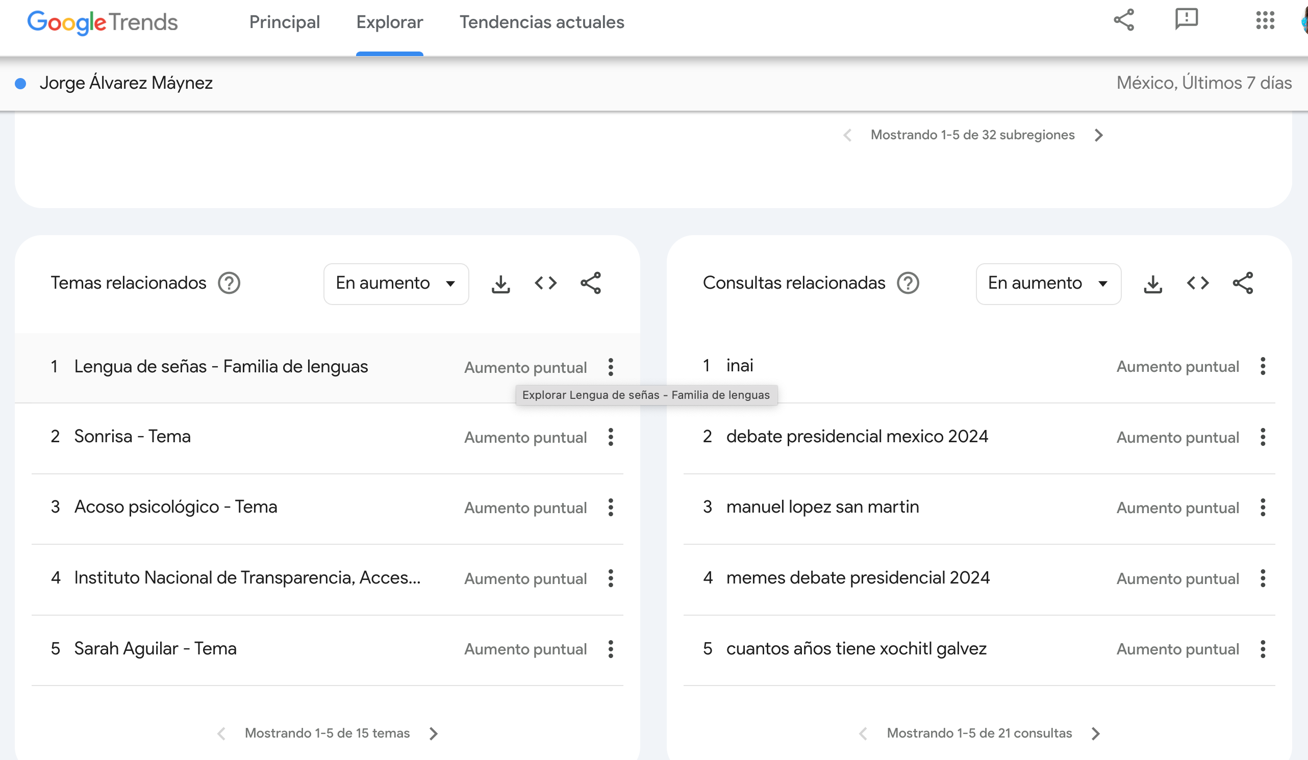 En tanto que en el caso de Jorge Álvarez Máynez, el pico de mayor interés y de búsquedas con respecto a él, se registra este 8 de abril, y los temas relacionados son: “lengua de señas”, “sonrisa”, “acoso psicológico” y Sarah Aguilar”.