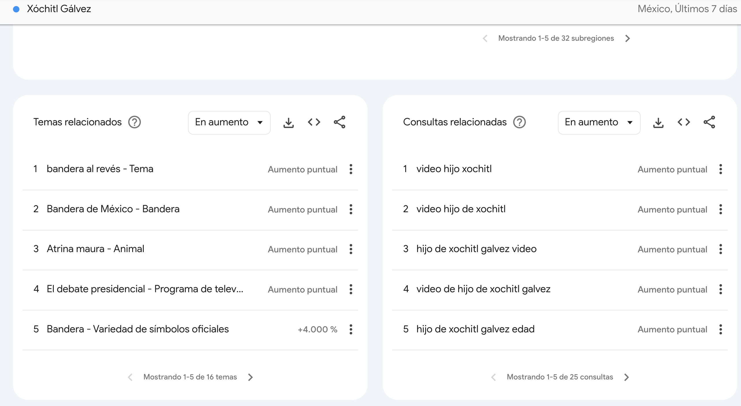 Sin embargo, la diferencia está en los temas por los que a cada uno de es busca o relaciona. En el caso de Xóchitl Gálvez, los temas por los que la están buscando más y va en aumento son “bandera al revés”, “bandera de México”, “Atrina maura”, “debate presidencial” y “bandera”.
