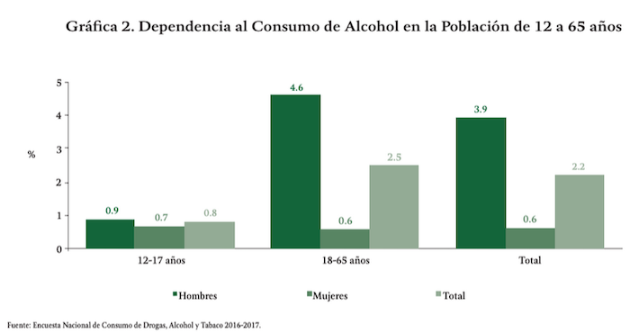 Además, la Encuesta Nacional de Consumo de Drogas, Alcohol y Tabaco (ENCODAT) 2016-2017 muestra que en la categoría de dependencia al alcohol para el rango de 12 a 17 años es de 0.9 por ciento en hombres y un 0.7 por ciento para mujeres.