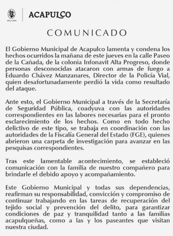 El Gobierno Municipal de Acapulco condenó y lamentó el ataque en contra del director de la Policía Vial, Eduardo Chávez Manzanares, ocurrido esta mañana en la calle Paseo de la Cañada, de la colonia Infonavit Alta Progreso.