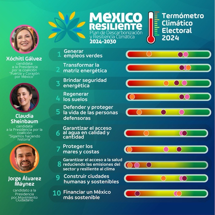 México Resiliente, una coalición de organizaciones civiles, analizó los documentos donde Claudia Sheinbaum (Morena-PT-PVEM), Xóchitl Gálvez (PRI-PAN-PRD) y Jorge Álvarez Máynez (Movimiento Ciudadano) presentan sus compromisos ambientales.