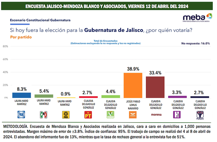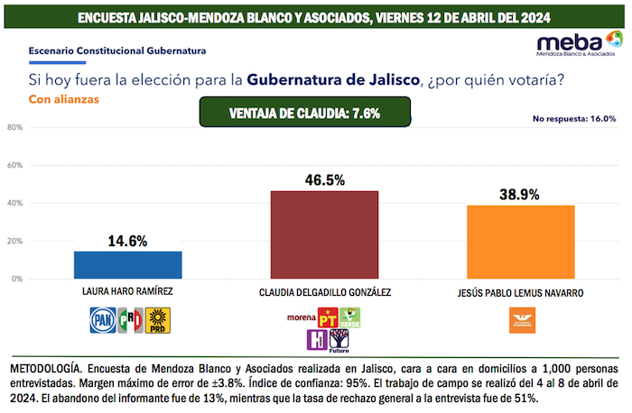 La consultora Mendoza Blanco y Asociados le confiere a Claudia Delgadillo González, la candidata de Morena, PT, PVEM, Hagamos y Futuro, una ventaja de 7.6 puntos porcentuales, con un respaldo del 46.5 por ciento, contra el 38.9 por ciento de Jesús Pablo Lemus Navarro, postulado por el partido Movimiento Ciudadano. La coalición PAN-PRI-PRD, encabezada por la priista Laura Haro Ramírez, está muy lejos de tener alguna posibilidad de triunfo en Jalisco, pues apenas refleja el respaldo del 14.6 por ciento de los ciudadanos encuestados.
