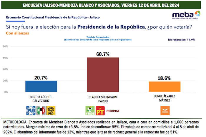 Un elemento que juega en favor de la alianza opositora es la fortaleza de la candidatura de Claudia Sheinbaum Pardo en Jalisco, que según la encuesta de Mendoza Blanco y Asociados, tendría el respaldo del 60.7 de los votantes potenciales, contra apenas el 20.7 por ciento de la candidata del PAN-PRI-PRD, Bertha Xóchitl Gálvez Ruiz. Incluso, es notable la recuperación del candidato presidencial de Movimiento Ciudadano en Jalisco, pues Jorge Álvarez Máynez tendría en esta entidad el 18.6 por ciento de respaldo electoral. Muy cerca de desplazar a la aspirante de Fuerza y Corazón por México.
