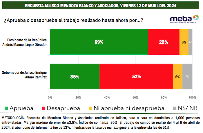Y como dato adicional de la encuesta de Mendoza Blanco y Asociados, apunte usted que en Jalisco el presidente Andrés Manuel López Obrador tendría el apoyo del 69 por ciento de los ciudadanos que aprueban su trabajo, contra apenas el 35 por ciento que piensa que su gobernador Enrique Alfaro Ramírez estaría haciendo bien su tarea.