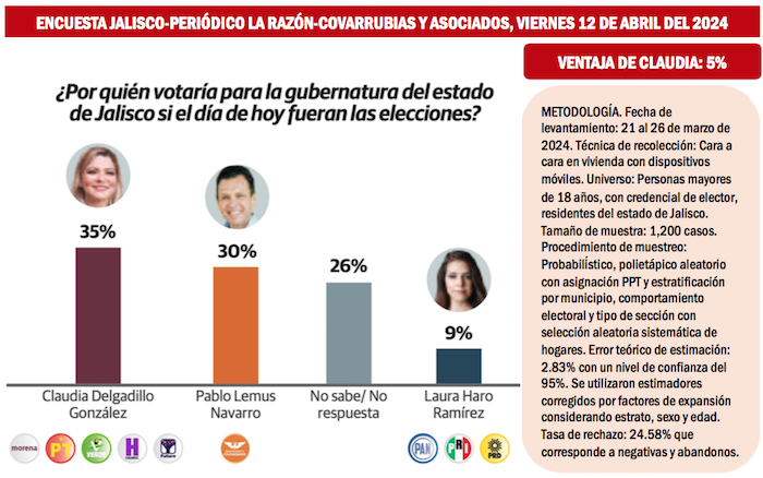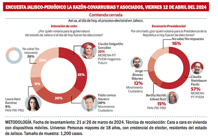 En la segunda encuesta que se publicó este viernes 12 de abril del 2024, en el periódico capitalino La Razón, realizada por Covarrubias y Asociados, Claudia Delgadillo González, quien encabeza la coalición Sigamos Haciendo Historia en Jalisco, a la que se sumaron los partidos locales Hagamos y Futuro, tendría el 35 por ciento de las preferencias de voto, contra el 30 por ciento de Jesús Pablo Lemus Navarro, del partido naranja y el 9 por ciento de Laura Haro Ramírez, de la coalición Fuerza y Corazón por Jalisco.