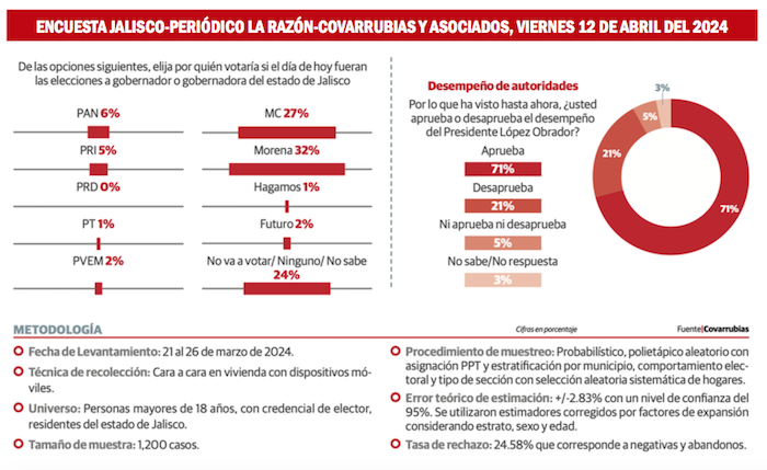 Ciudad de México, 12 de abril (SinEmbargo).– En el preámbulo del segundo debate entre candidatos a la gubernatura de Jalisco, que se realizará este sábado 13 de abril del 2024, el partido Morena, que encabeza una poderosa coalición opositora en esa entidad, tomó la delantera según el recuento de dos estudios demoscópicos publicados este viernes 12 de abril del 2024, uno por el periódico capitalino La Razón, en alianza con Covarrubias y Asociados, y otro dado a conocer por la consultora Mendoza Blanco y Asociados. Estas dos encuestas, según su vitrina metodológica, fueron realizados en hogares, cara a cara con las personas entrevistadas.