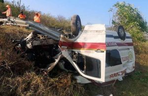 La ambulancia del ISSSTE de Tamazunchale, habilitada para traslados programados, chocó contra un muro de contención y después volcó en la autopista Valles-Rayón.