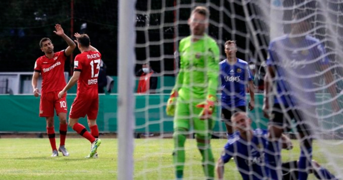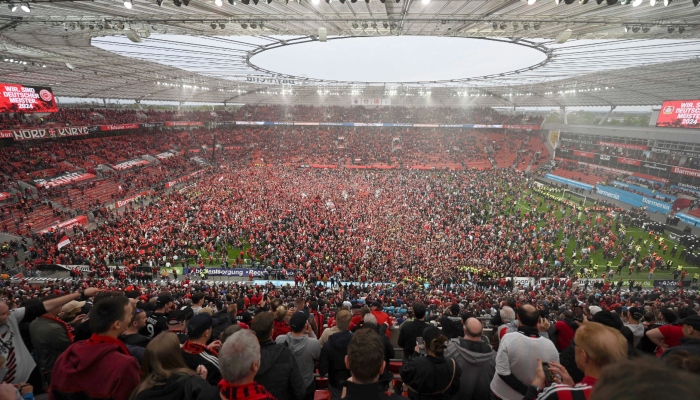Los aficionados irrumpieron la cancha cuando el Leverkusen anotó su cuarto gol a siete minutos del final y los minutos finales se tuvieron que disputar en medio del denso humo rojo después de que los seguidores lanzaron bengalas mientras los jugadores en la banca del Leverkusen aplaudieron y bailaron con las canciones mientras se abrazaban.