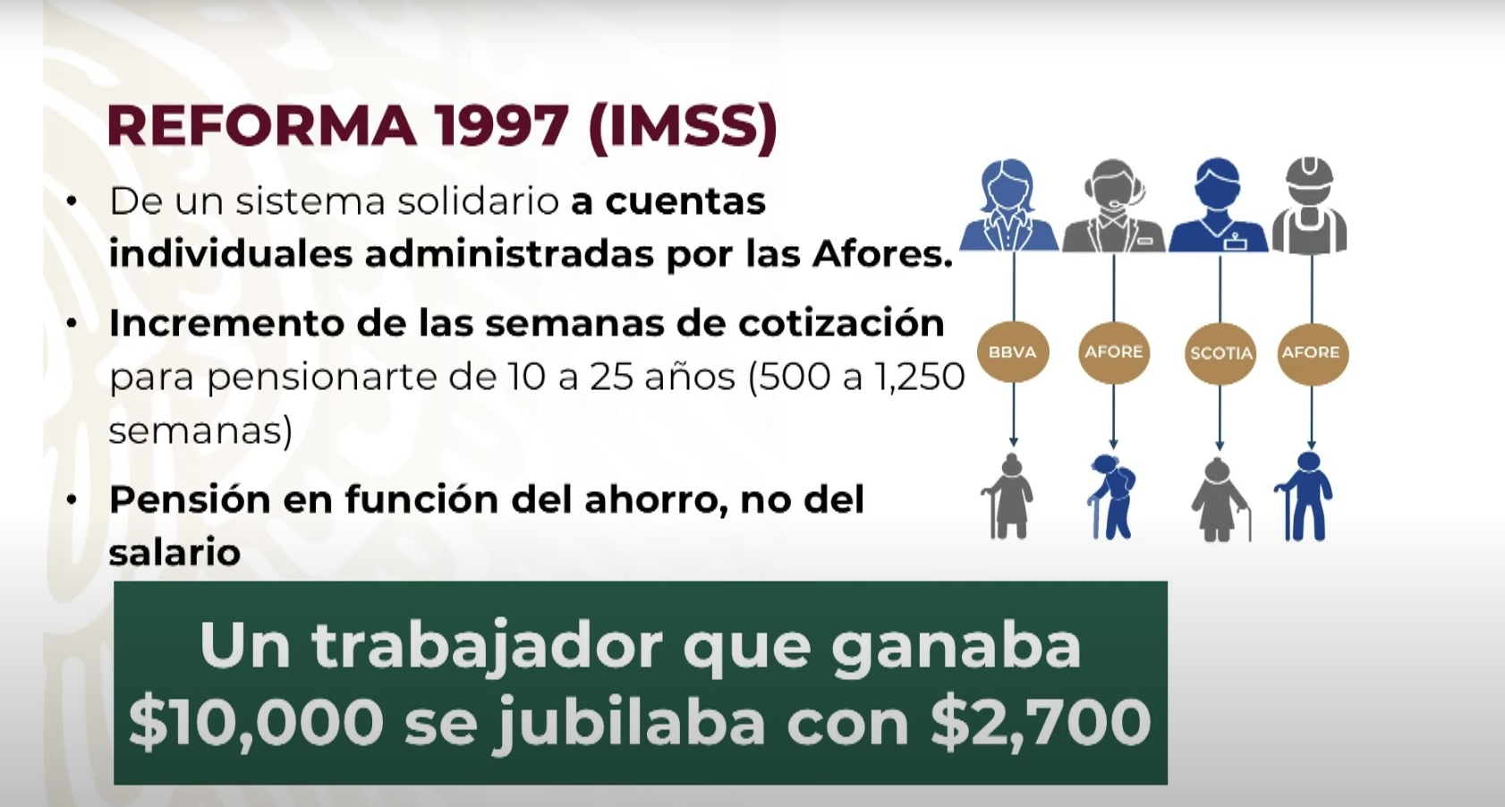 –La pensión se otorgaría en función del ahorro, no del salario. Por ejemplo, un trabajador que ganaba 10 mil pesos mensuales se jubilaba con 2 mil 700 pesos al mes.