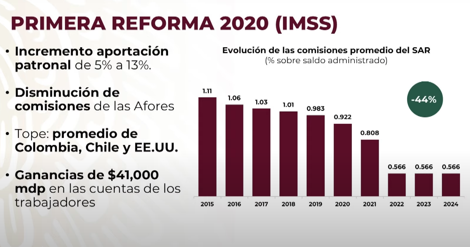 En esta reforma se incrementó la aportación patronal del 15 al 13 por ciento; se disminuyó las comisiones de las Afores, previo a la reforma, las 10 Afores que operan en México cobraban 0.98 por ciento de comisión, como mínimo, y a partir de 2022 bajó a 0.57 por ciento con la entrada en vigor de la legislación.