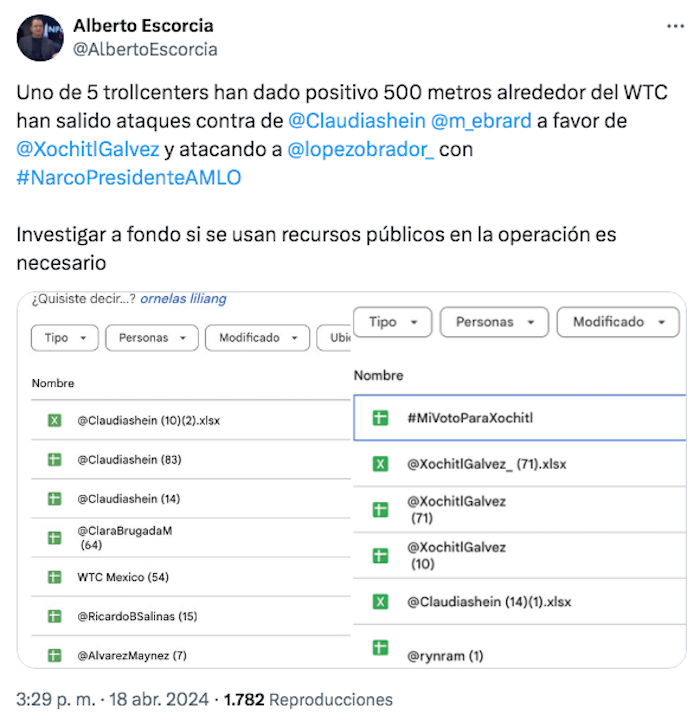 "En un programa puse las coordenadas de estos troll centers, cuatro en la CdMx y uno en Zapopan, y durante dos meses esperando que cometieran un error justamente crearon este trending topic que se llama #MiVotoParaXóchitl y gracias a éste encuentro varias cuentas que provenían de un troll center muy cerca del WTC de la CdMx. Ese es el resumen y puede ser una operación millonaria, yo le calculo unos 5 millones de dólares", destacó el periodista.