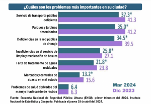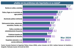 Entre enero y marzo del 2024, de acuerdo con los resultados de la Encuesta Nacional de Seguridad Pública Urbana (ENSU) correspondiente al primer trimestre de 2024, el 77.5 por ciento de la población de 18 años y más consideró los baches en calles y avenidas como uno de los problemas más importantes en su ciudad; el 62.3 por ciento dijo que lo eran las fallas y fugas en el suministro de agua potable y el 54.8 por ciento, el alumbrado público insuficiente. De la población de 18 años y más, el 39.3 por ciento respondió que los hospitales saturados o los servicios médicos insuficientes y deficientes representan uno de los principales problemas en su entorno.