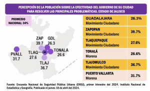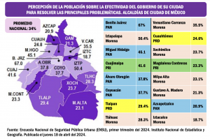 En marzo de 2024, a nivel nacional, 34.0 por ciento de la población de 18 años y más consideró al gobierno de su ciudad como muy o algo efectivo para resolver los problemas más importantes. Las ciudades o alcaldías donde mejor se percibió el trabajo de sus gobernantes fueron: Benito Juárez, Ciudad de México, con 67.0 por ciento; Nuevo Laredo, Tamaulipas, con 61.1 por ciento y Mérida, Yucatán, con 57.1 por ciento. Las ciudades donde menos se percibió la efectividad de las autoridades fueron: Ecatepec de Morelos, Estado de México, con 13.4 por ciento; Fresnillo, Zacatecas, con 14.8 por ciento y Naucalpan de Juárez, Estado de México, con 16.4 por ciento.