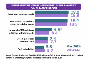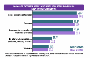 Para mantenerse al tanto de la información sobre la seguridad pública, el narcotráfico y la delincuencia en general, 58.6 por ciento de la población de 18 años y más dijo estar atenta a noticieros en televisión y 53.8 por ciento respondió que lo hace mediante la red social Facebook. Para 53.7 por ciento de la población, obtiene información fue por medio de la comunicación personal en el entorno de su vivienda y 25.7 por ciento lo hace a través de internet.