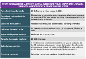 La encuesta, realizada por el Instituto Nacional de Estadística y Geofgrafía (INEGI), se realizó entre el 23 de febrero y el 15 de marzo de 2024. La muestra incluyó 27,850 entrevistas en vivienda, cara a cara, mediante dispositivo electrónico. La encuesta se llevó a cabo en 90 ciudades del país, incluyendo las 16 alcaldías de la Ciudad de México. Se incluyó por lo menos una ciudad de las 32 entidades federativas del país.