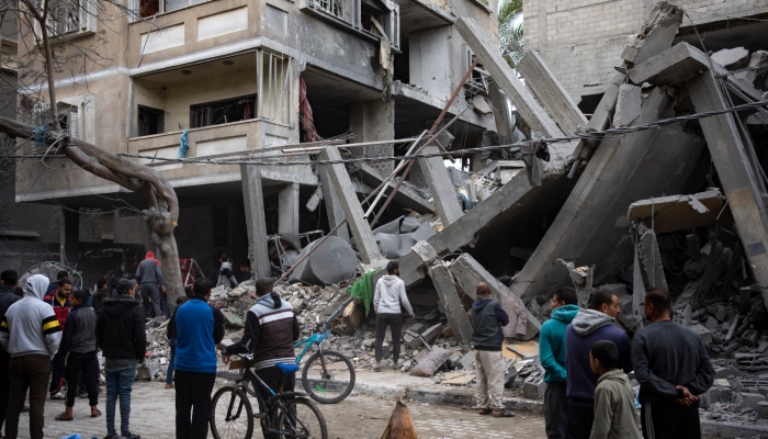 Palestinos inspeccionan los daños a edificios residenciales tras un ataque aéreo en Rafah, en el sur de la Franja de Gaza, el domingo 24 de marzo de 2024. Foto: Fatima Shbair, AP.