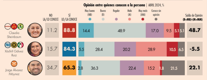 Álvarez Máynez, por su parte, tiene 2.8 por ciento de opinión "muy buena" y 36.3 por ciento en "buena", 7.9 puntos porcentuales más que la candidata del PRIAN. En las opiniones negativas obtiene 15.2 por ciento en "mala" y 1.8 por ciento en "muy mala", porcentajes inferiores a los de Gálvez.