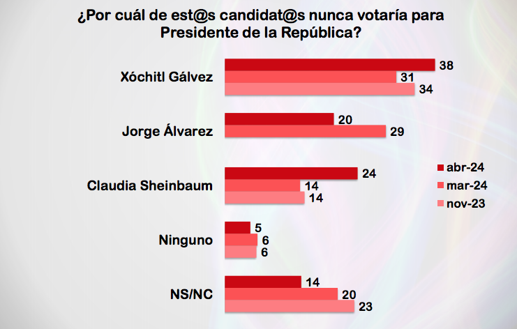En su más reciente encuesta, levantada del 9 al 16 de abril, una de las preguntas es "¿por cuál de estos candidatos nunca votaría para Presidente de la República?", donde la abanderada del PRIAN se coloca en primer lugar con el 38 por ciento. Le siguen Claudia Sheinbaum con el 24 por ciento y Jorge Álvarez con el 20 por ciento.