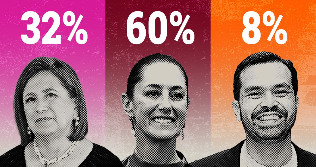 Las cifras del Barómetro Bloomberg —con corte al 14 de abril pasado—colocan a Sheinbaum Pardo con una intención de voto efectiva del 60 por ciento; a Gálvez con un 32 por ciento, y a Jorge Álvarez Máynez, del partido Movimiento Ciudadano, con un 8 por ciento.