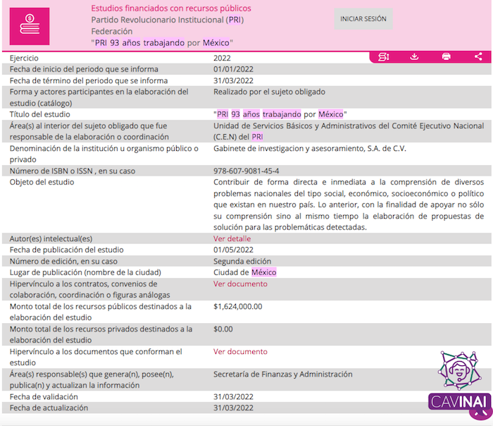 El 17 de abril de 2023, el PRI celebró tres contratos para la realización e impresión de tres libros. Los tres fueron para la empresa “Gabinete de Investigación y Asesoramiento, S.A. de C.V.”. Sólo ese día, por 3 mil libros, la compañía ganó 346 mil 548 pesos del presupuesto público que se otorga al tricolor. En los últimos tres años, hay registro de un gasto de 3 millones 353 mil 348 pesos en publicaciones ordenadas por el propio partido.