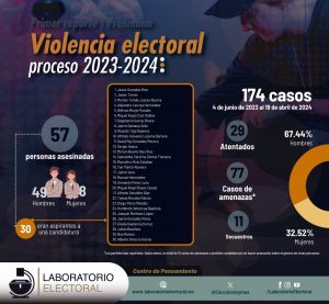Desde el 4 de junio de 2023 hasta el 19 de abril de 2024 se han presentado 174 casos de violencia electoral. incluidos 29 atentados, 77 casos de amenazas y 11 secuestros. De los datos disponibles –hay 51 amenazas que los partidos reportaron pero sin detallar el género de los protagonistas– un 67.44 por ciento son hombres y un 32.52 por ciento son mujeres las que recibieron estas agresiones.