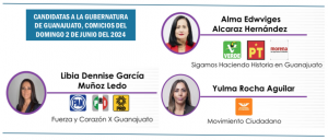 García Muñoz Ledo, de la coalición Fuerza y Corazón por Guanajuato, y Yulma Rocha Aguilar, del partido Movimiento Ciudadano, estuvieron frente a frente el martes 16 de abril del 2024, en el primer debate entre candidatas a la gubernatura de Guanajuato,  el cual fue organizado por la Confederación Patronal de la República Mexicana (Coparmex) en esa entidad. La candidata de Morena, Alcaraz Hernández no asistió al debate debido a que reclamó un cambio de formato un día antes del evento.