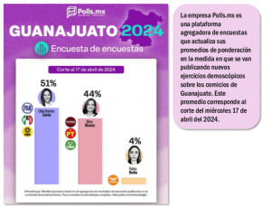 Al cumplirse dos meses de campaña en Guanajuato, la candidata de PAN, PRI, PRD tiene márgenes de ventaja de entre 10 y 12 puntos sobre la aspirante de la coalición Morena, PT y Partido Verde, Alma Edwviges Alcaraz Hernández. Muy lejos, en una tercera posición, aparece Yulma Rocha Aguilar, del partido Movimiento Ciudadano, sin posibilidades de aspirar a la victoria.