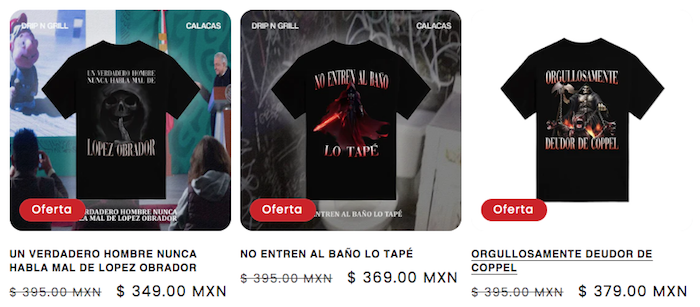 Aunque se esperaría que la playera de Obrador fuera la única pieza con la imagen de una "calaca chida", la realidad es que la marca cuenta con varios modelos en los que se pueden leer otras frases graciosas como "no entren al baño, lo tapé", "orgullosamente deudor de Coppel", "para los envidiosos que dijeron que no podría lograrlo, tenían razón", "yo no publico logros porque no los tengo", por mencionar algunas.
