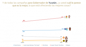Ciudad de México, 3 de mayo (SinEmbargo).– La más reciente encuesta De las Heras dio a conocer esta mañana que Joaquín Díaz Mena, mejor conocido como “Huacho”, representante de Morena, domina la carrera por el Gobierno de Yucatán con una diferencia de 19 puntos porcentuales sobre el panista Renán Barrera Concha; y que Vida Gómez, de Movimiento Ciudadano (MC), quien se queda en tercer lugar.