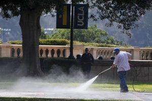 Un hombre limpia el suelo luego de que la policía retiró un campamento de protesta propalestino en el campus de la Universidad de California en Los Ángeles, el jueves 2 de mayo de 2024. Foto: Mark J. Terrill, AP.
